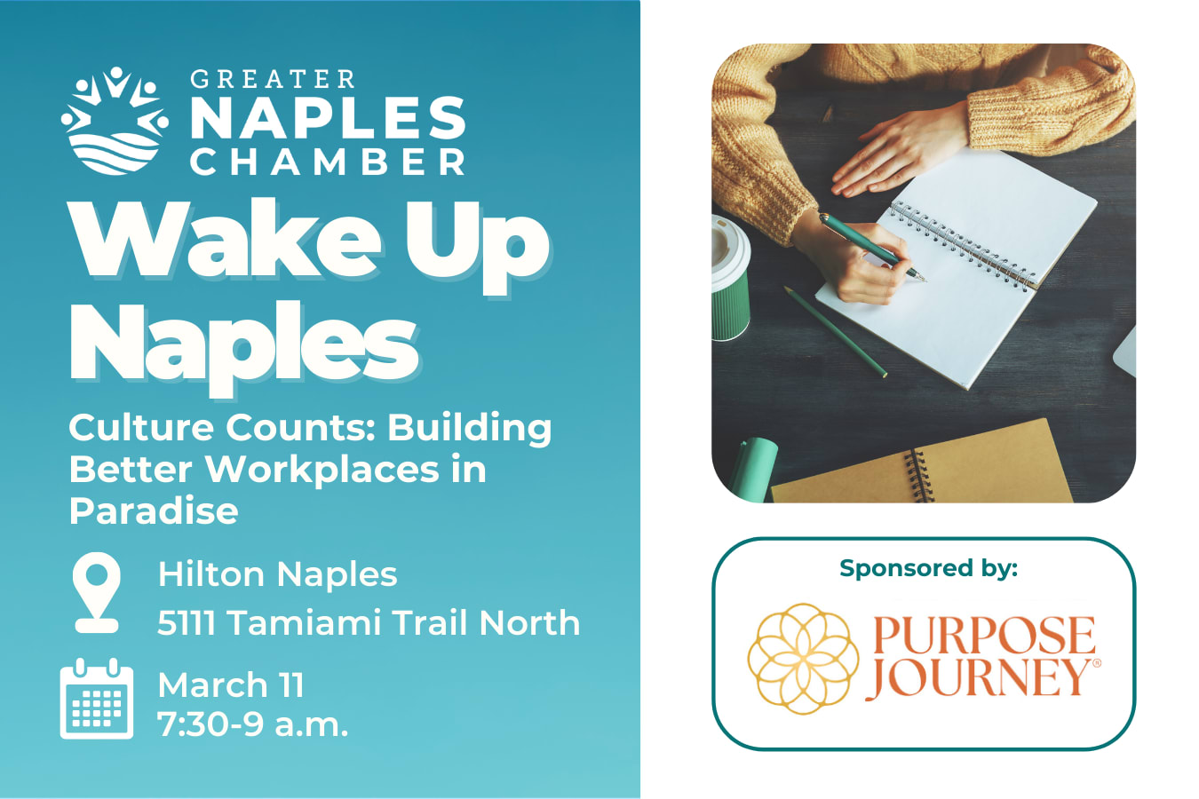 Event Day Sponsor* $1,4000 (SOLD)The Wake Up Naples event day sponsorship includes the opportunity to take to the stage to address attendees and spotlight your company in addition to having your business name or logo displayed in marketing materials related to the specific event, including: