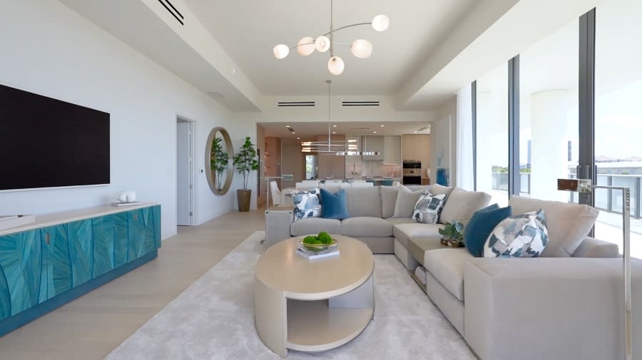 The model’s wraparound terrace is accentuated with private sitting and gathering areas featuring an upholstered sectional, a dining table and teal woven chairs.